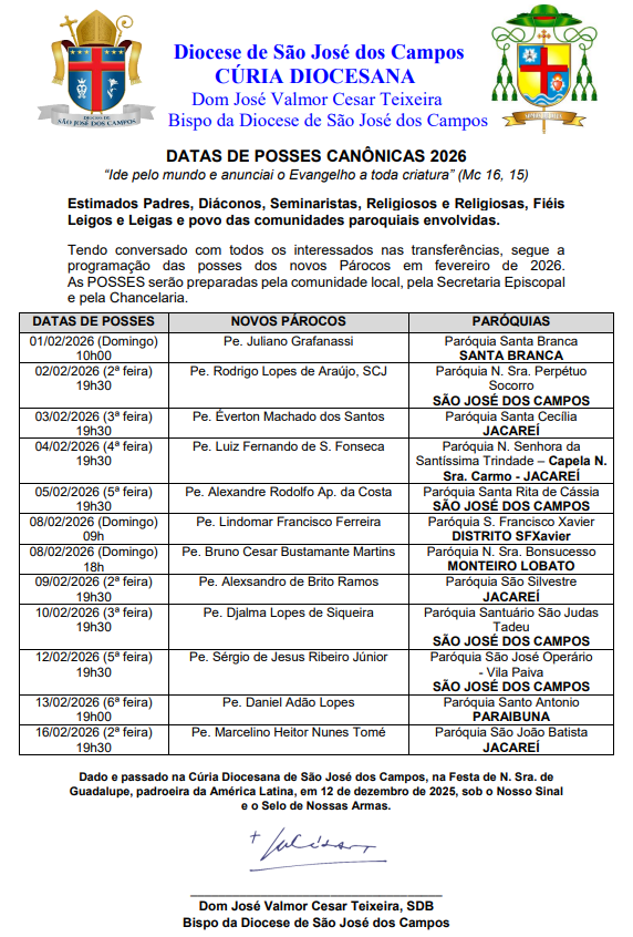 Tendo conversado com todos os interessados nas transferências, segue a programação das posses dos novos Párocos em fevereiro de 2026.